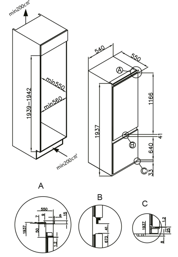 холодильник-морозильник встраиваемый, 281 л, класс энергопотребления А+, DeFrost, 54x55x193,7 см, белый