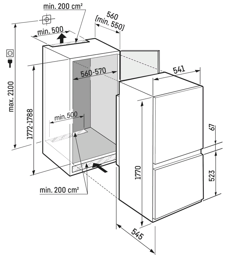 холодильник-морозильник встраиваемый, 255 л, класс энергопотребления А++, ручная система размораживания, 54,1х54,5х177 см