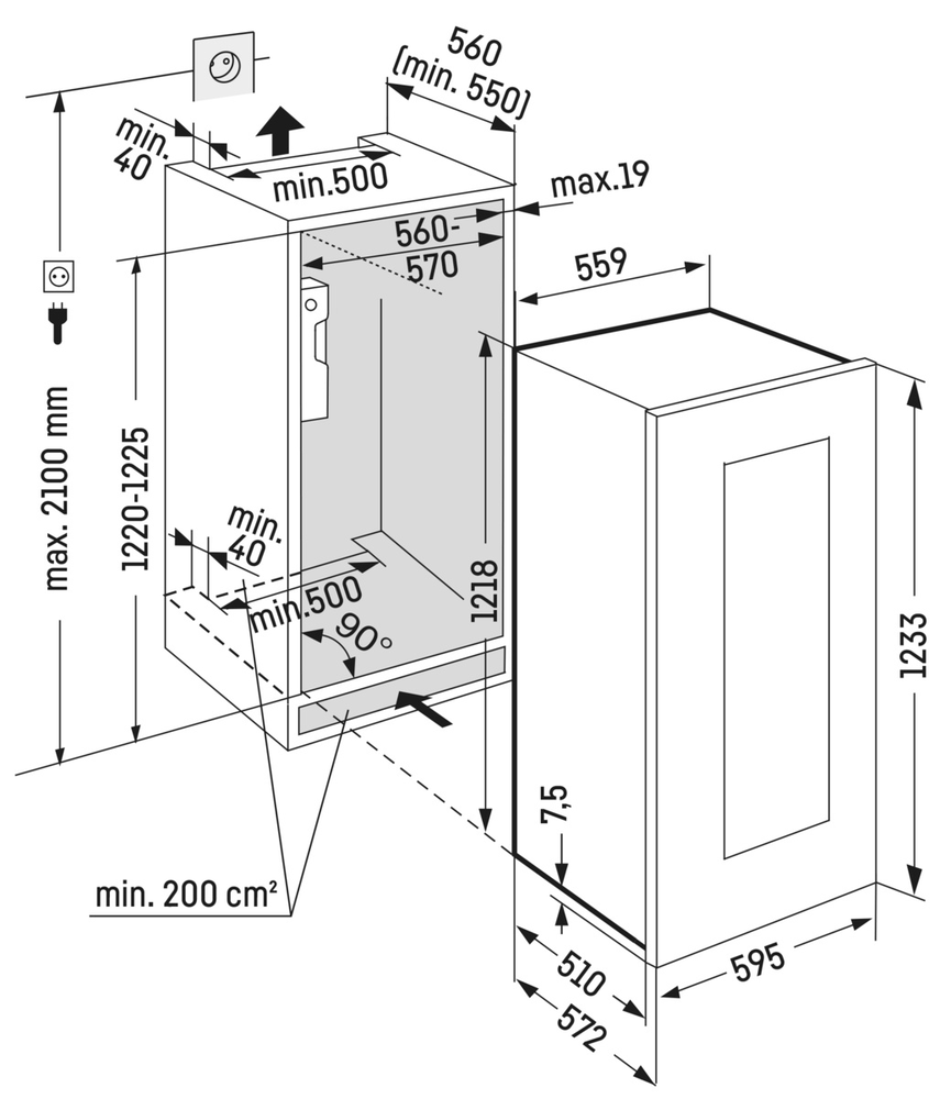 винный шкаф встраиваемый, 169 л, класс энергопотребления А, 59.5x57.2x123.3 см. черный