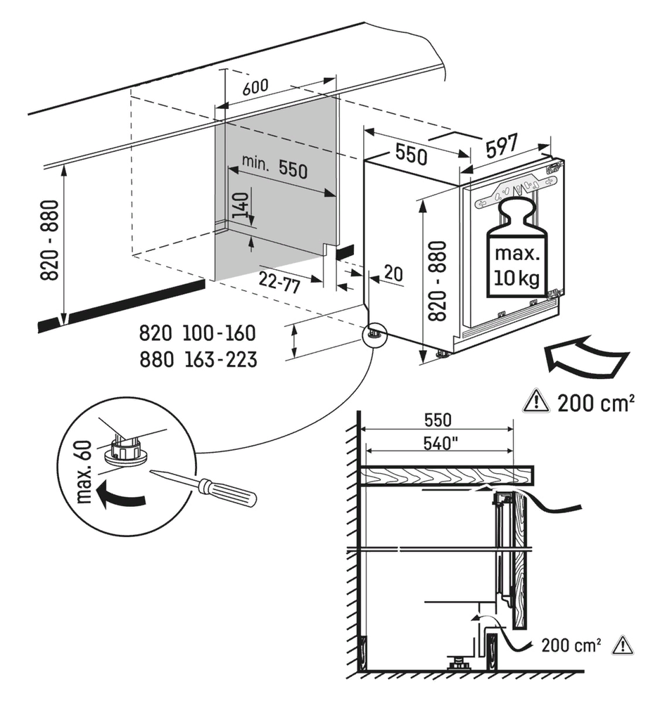 холодильник однокамерный встраиваемый, 136 л, класс энергопотребления А++, капельная система размораживания, 59,7x55x82 см, белый