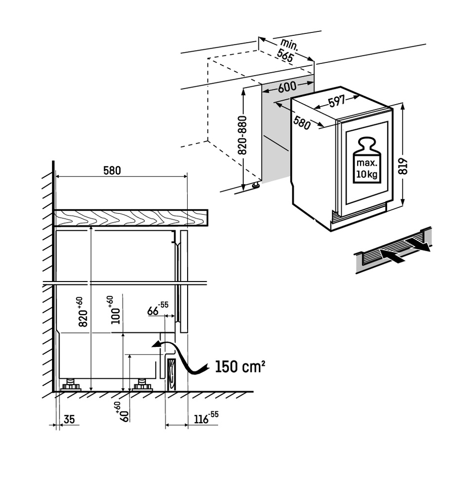 винный шкаф встраиваемый, 95 л, 59,7х57,9х81,9 см, черный