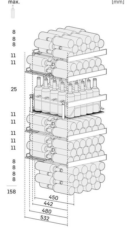 Вместимость или емкость винного шкафа определяется количеством установленных в нем ячеек для бутылок со стандартным объемом 0,75 л.