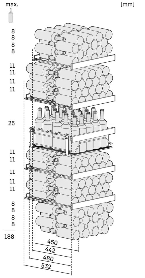 Вместимость или емкость винного шкафа определяется количеством установленных в нем ячеек для бутылок со стандартным объемом 0,75 л.