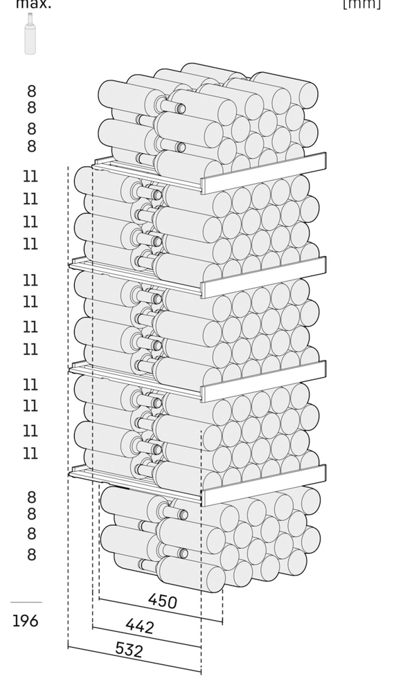 Вместимость или емкость винного шкафа определяется количеством установленных в нем ячеек для бутылок со стандартным объемом 0,75 л.