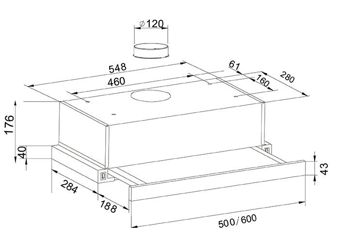 вытяжка встраиваемая телескопическая, 50 см, 500 м3/ч, нержавеющая сталь