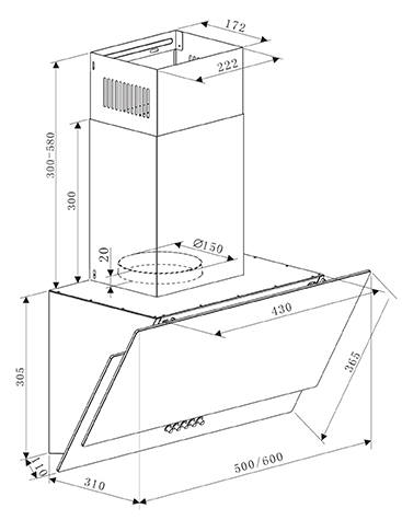 вытяжка наклонная, 50 см, 700 м3/ч, черный