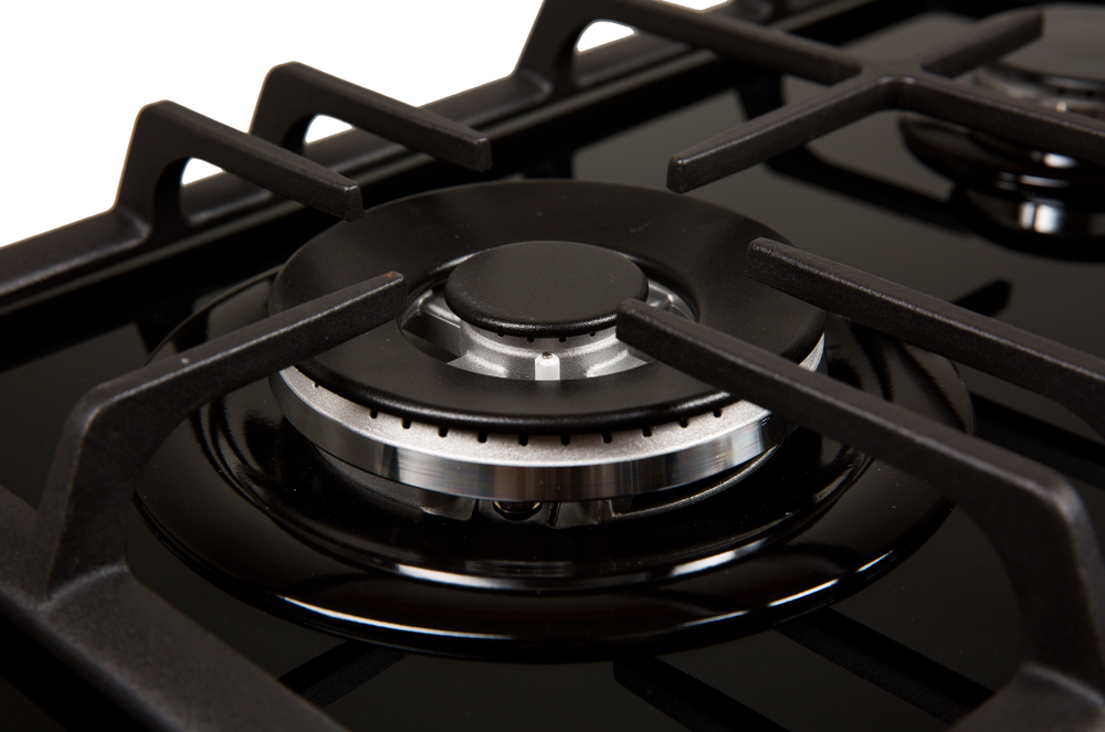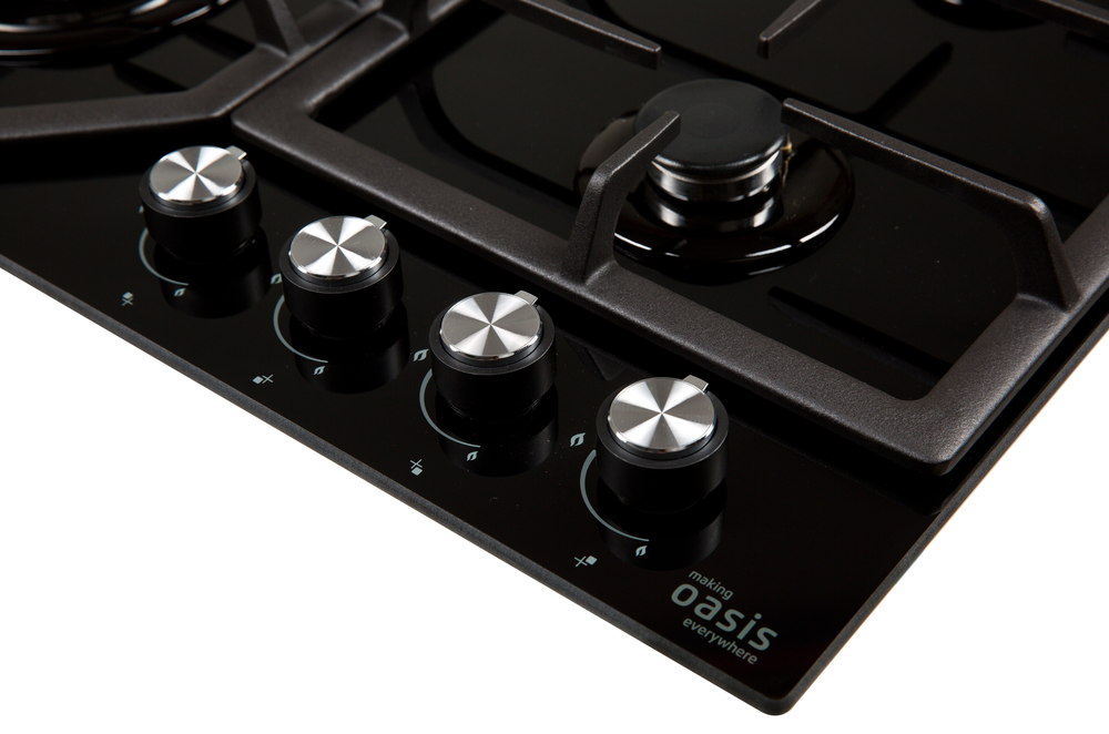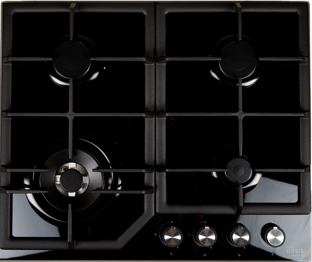 поверхность газовая, 60 см, газ на стекле, 4 конфорки, решетки чугунные, черный