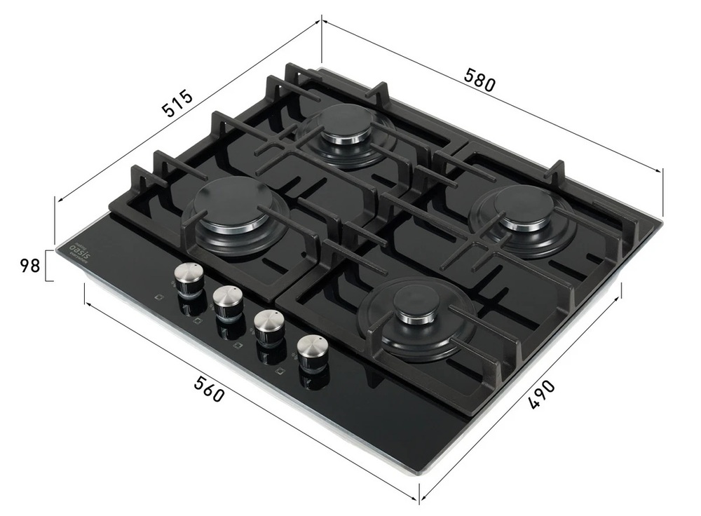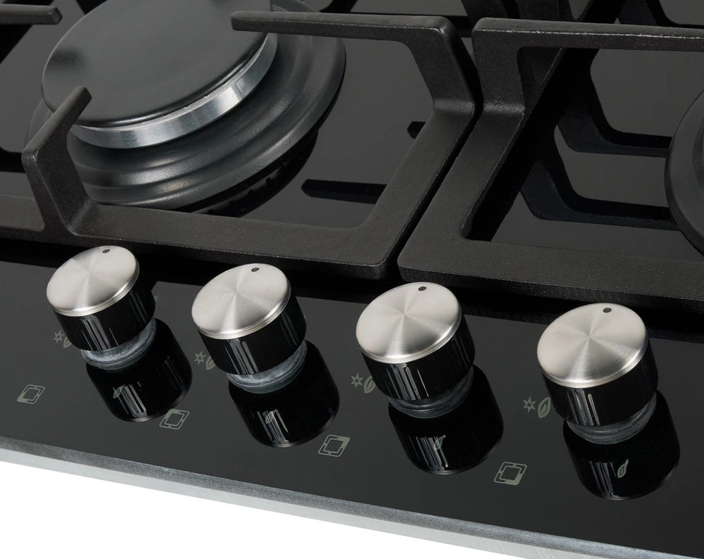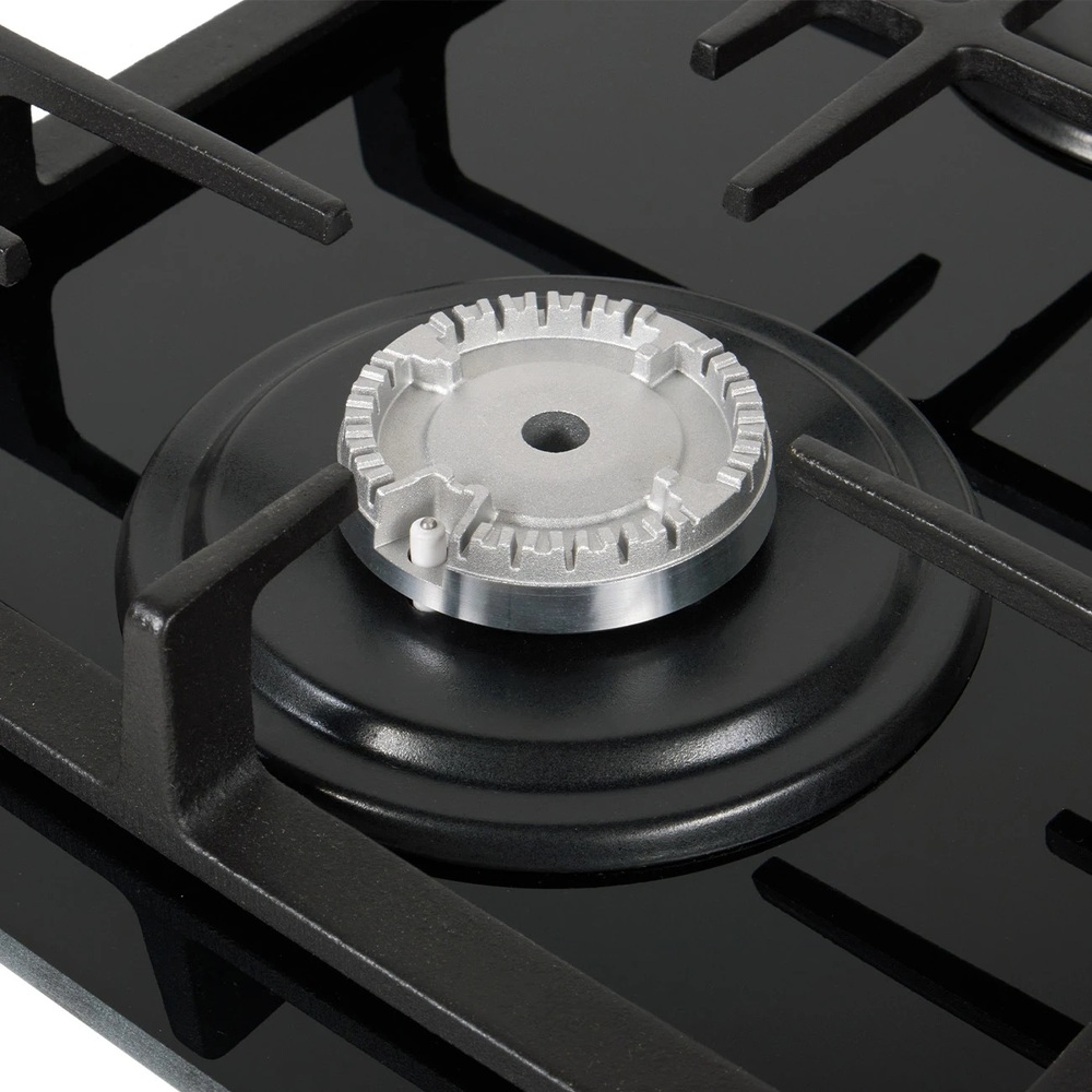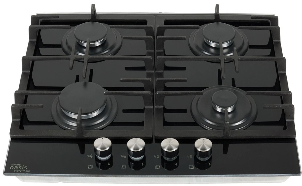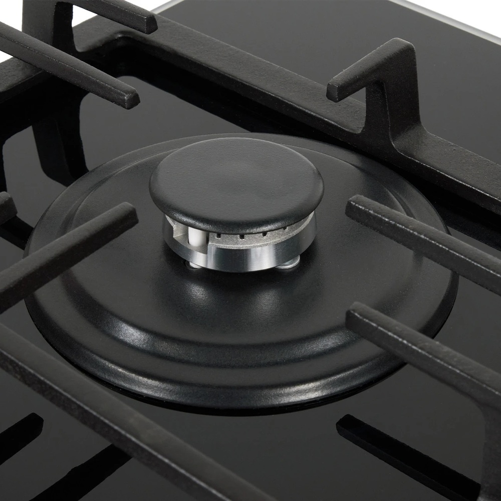 поверхность газовая, 60 см, газ на стекле, 4 конфорки, решетки чугунные, черный