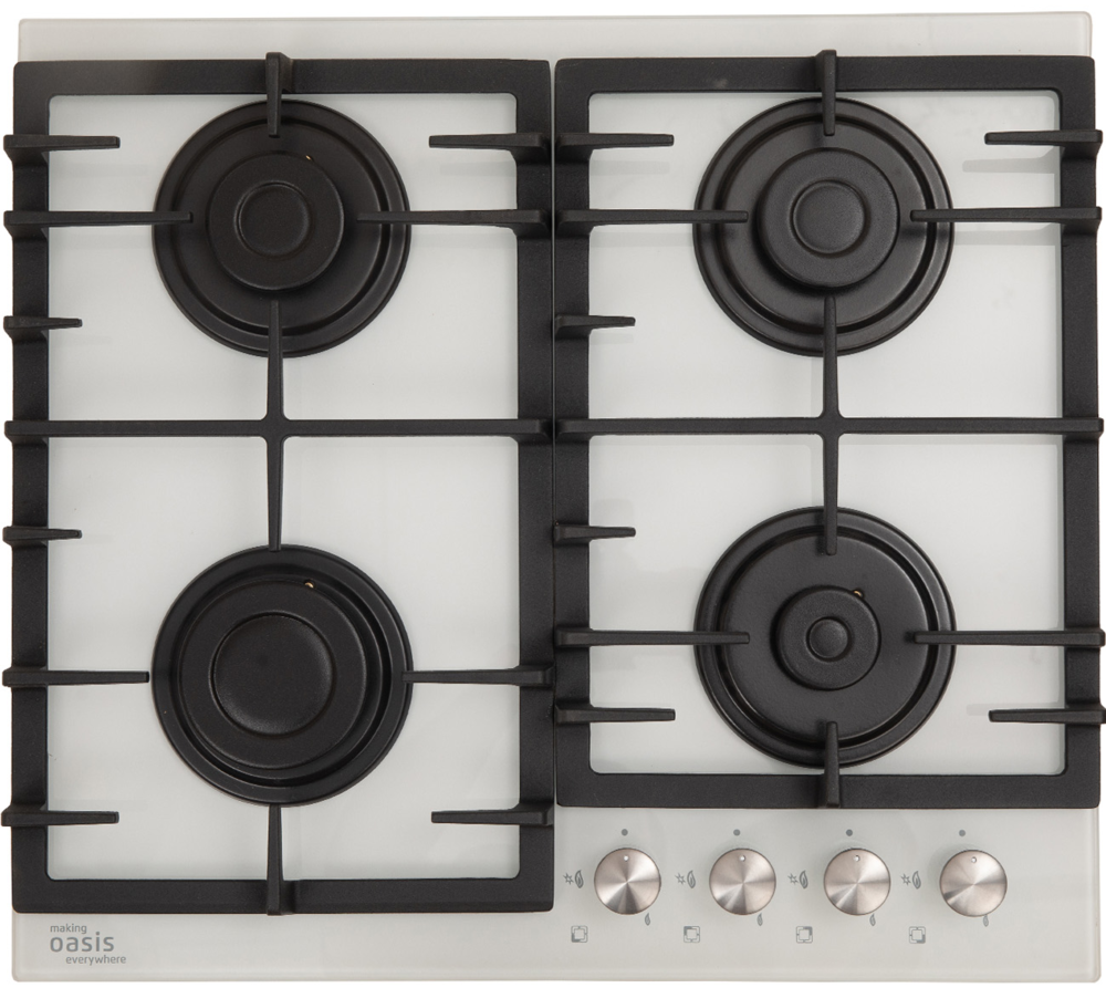 поверхность газовая, 60 см, газ на стекле, 4 конфорки, решетки чугунные, белый