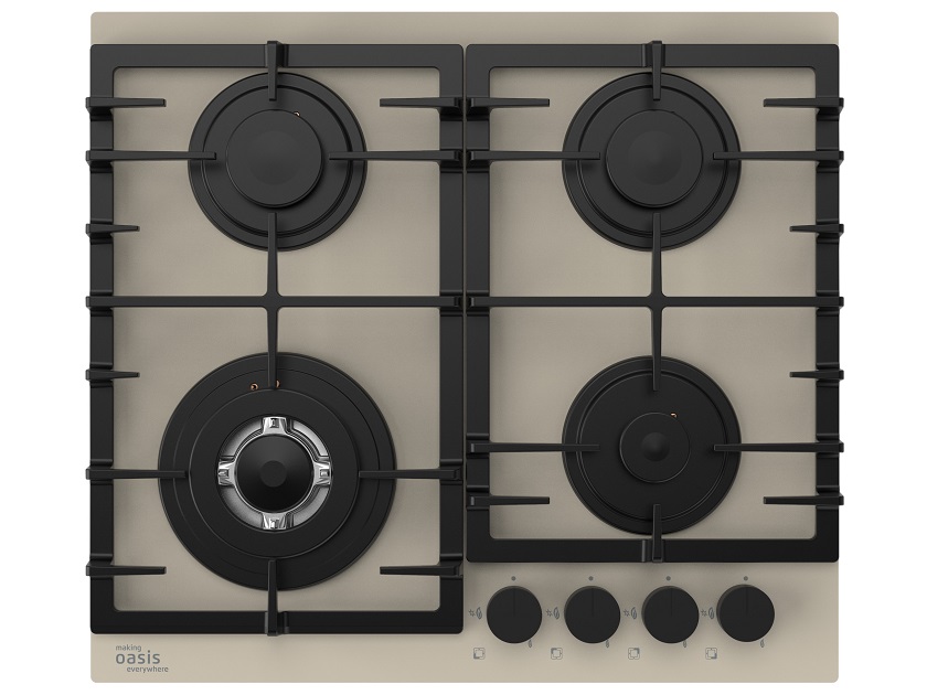 поверхность газовая, 60 см, газ на стекле, 4 конфорки, чугуные решетки, бежевый