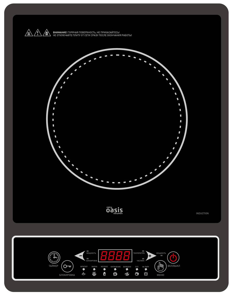 На варочной поверхности может быть от 2 до 8 электрических конфорок с индукционным нагревом. Для них нужна специальная посуда.