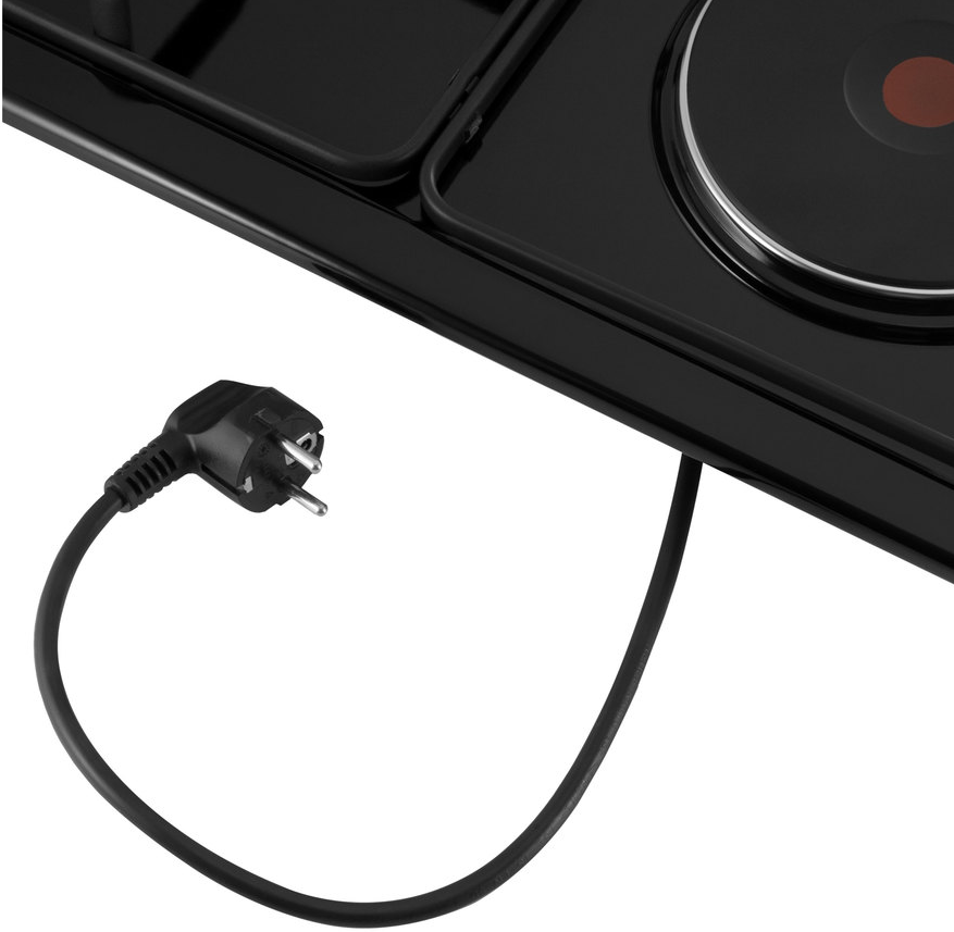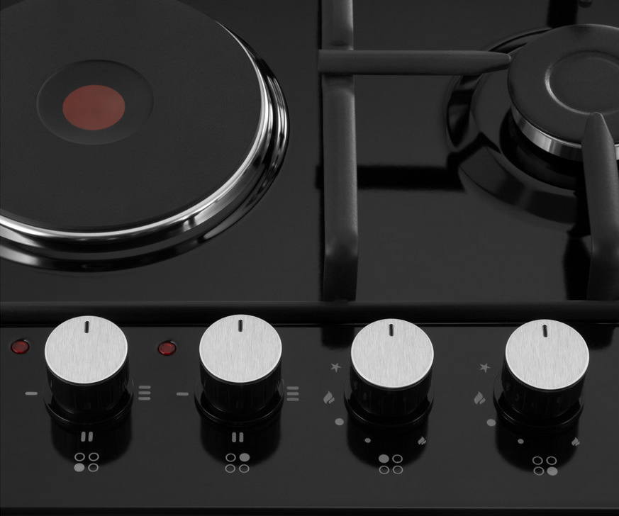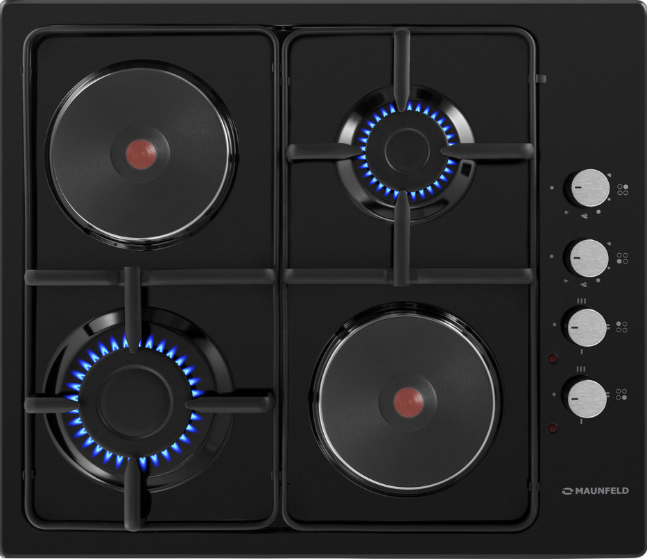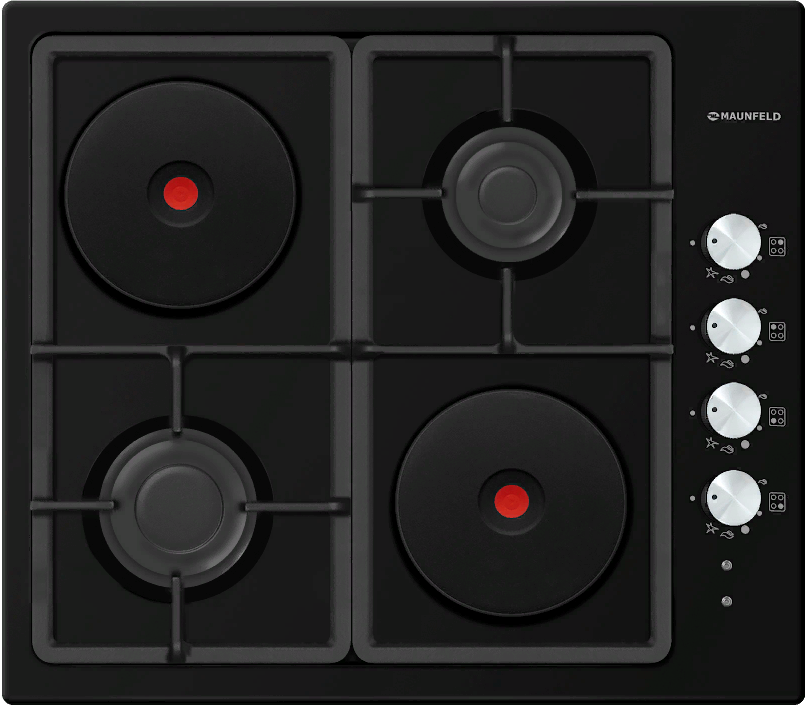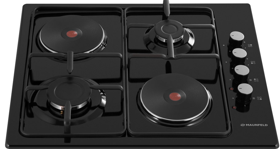 поверхность комбинированная, 60 см, 4 конфорки ( 2 - газовых, 2 - электрических), чугунные решетки, черный