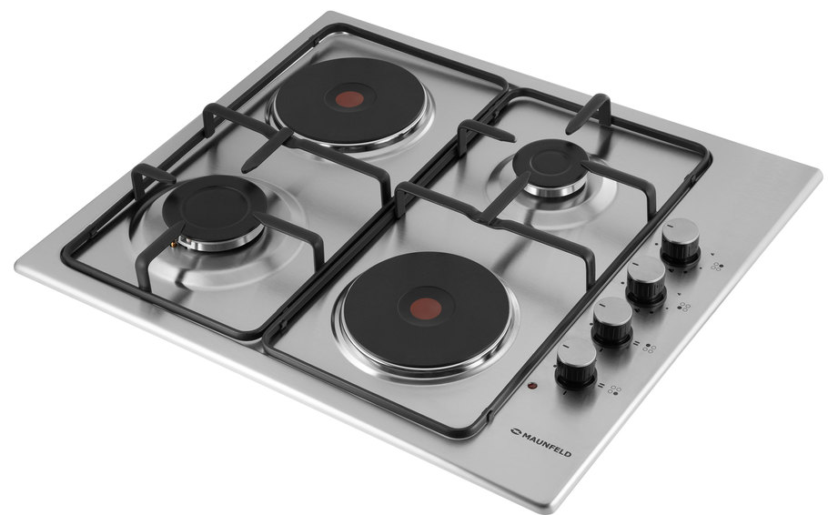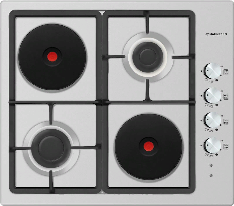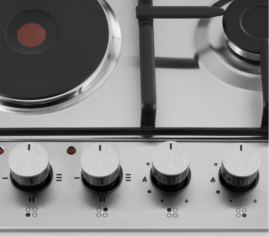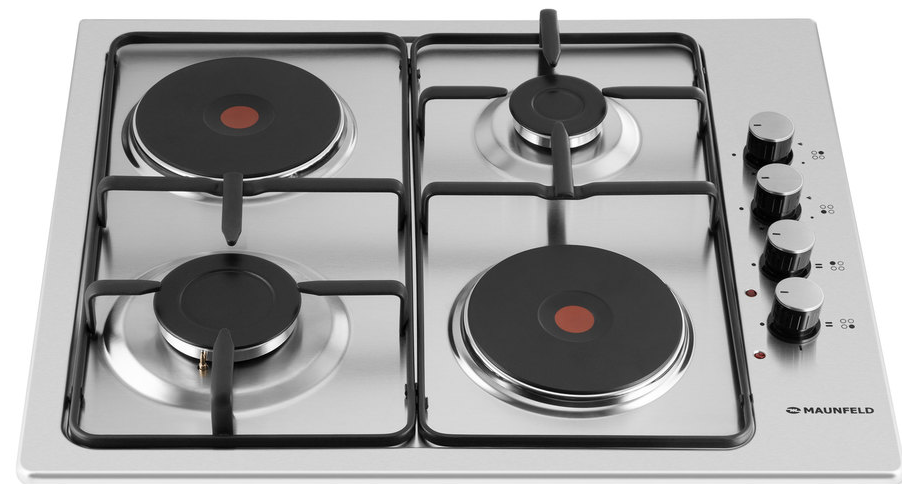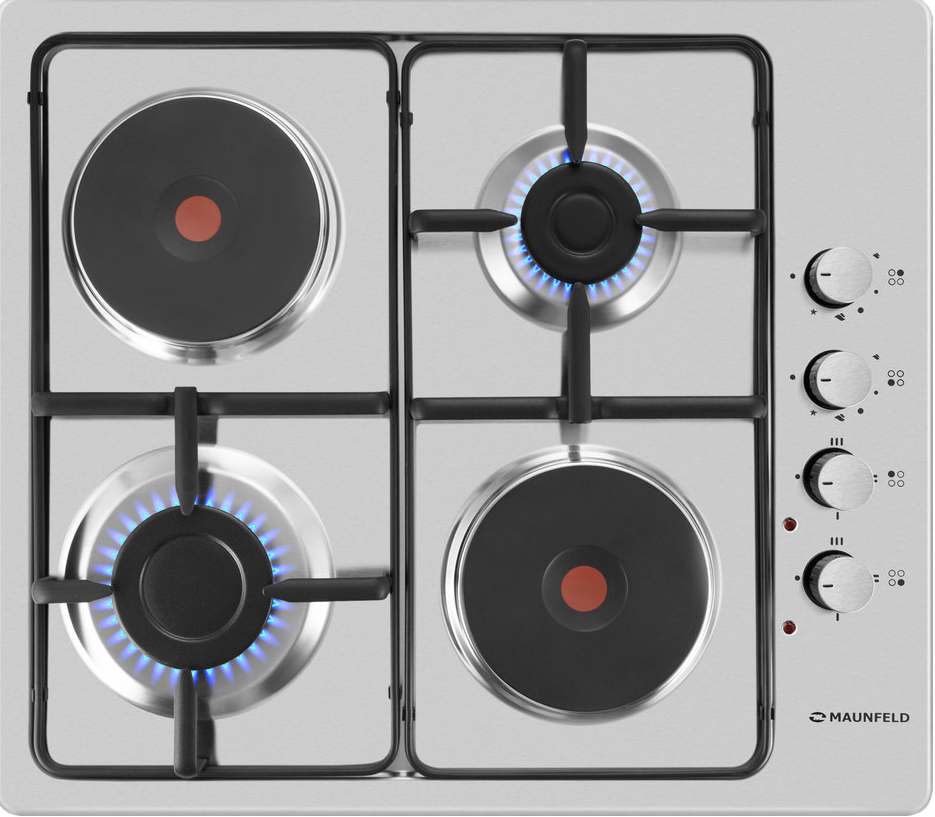поверхность комбинированная, 60 см, 4 конфорки (2 - газовые, 2 - электрические), нержавеющая сталь