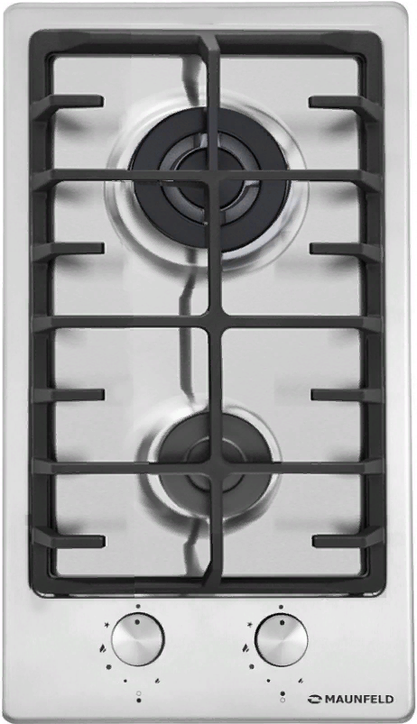 поверхность газовая, 30 см, газ на металле, 2 конфорки, решетки чугунные, нержавеющая сталь