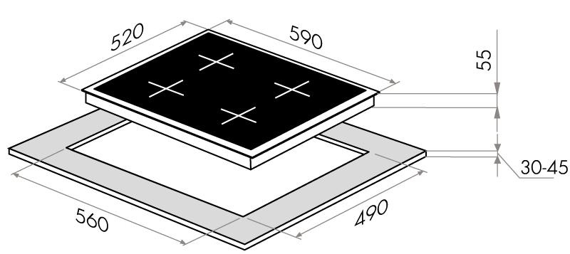 Характер огранки фаски на внешней стороне варочной панели. Металлические рамки предотвращают забивание монтажных швов крошками и пылью.