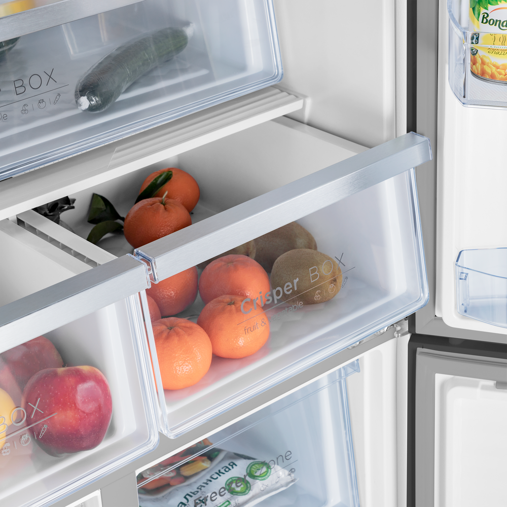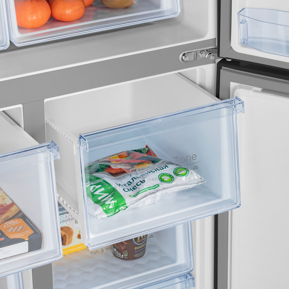В зоне свежести температура держится на уровне 0°С, так продукты дольше остаются свежими. Подходит для свежего мяса, рыбы, фруктов, овощей.