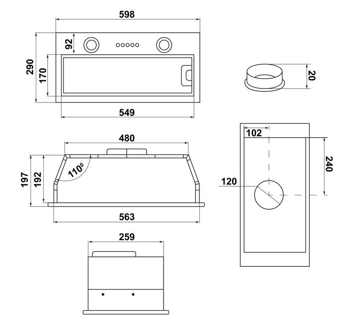 вытяжка встраиваемая в подвесной шкаф, 60 см, 520 м3/ч, черный
