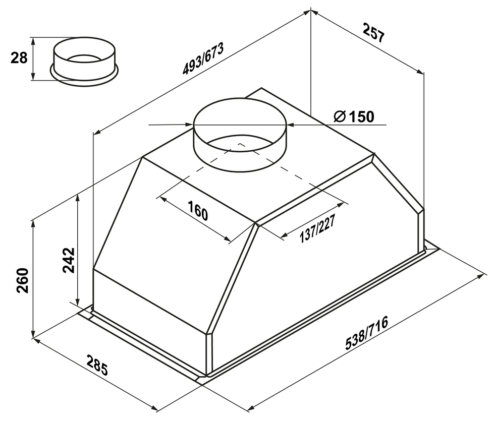 вытяжка встраиваемая в подвесной шкаф, 54 см, 1250 м3/ч, нержавеющая сталь