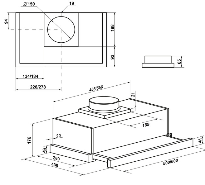 вытяжка встраиваемая телескопическая, 50 см, 850 м3/ч,черный