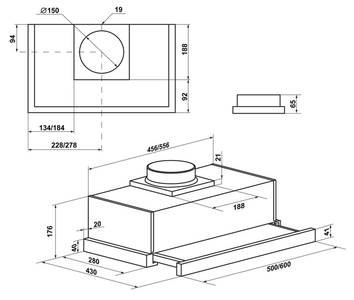 вытяжка встраиваемая телескопическая, 60 см, 850 м3/ч, черный