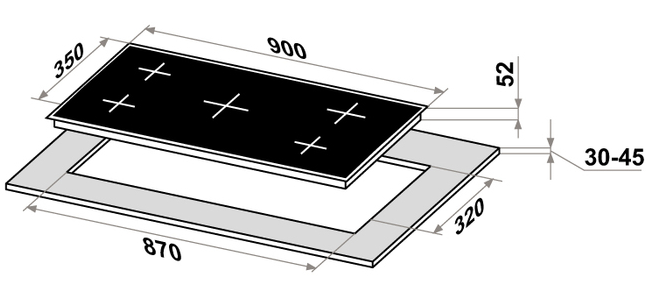 Характер огранки фаски на внешней стороне варочной панели. Металлические рамки предотвращают забивание монтажных швов крошками и пылью.