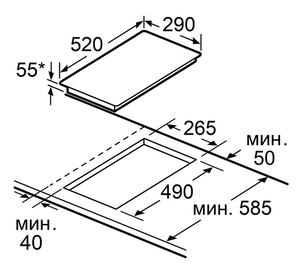 Характер огранки фаски на внешней стороне варочной панели. Металлические рамки предотвращают забивание монтажных швов крошками и пылью.