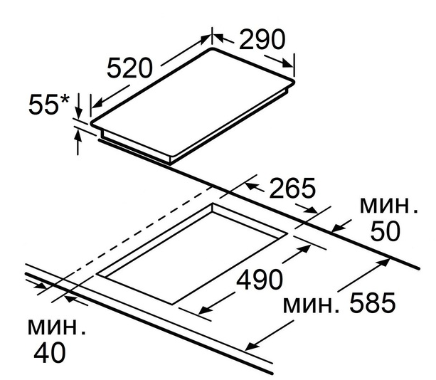 Характер огранки фаски на внешней стороне варочной панели. Металлические рамки предотвращают забивание монтажных швов крошками и пылью.