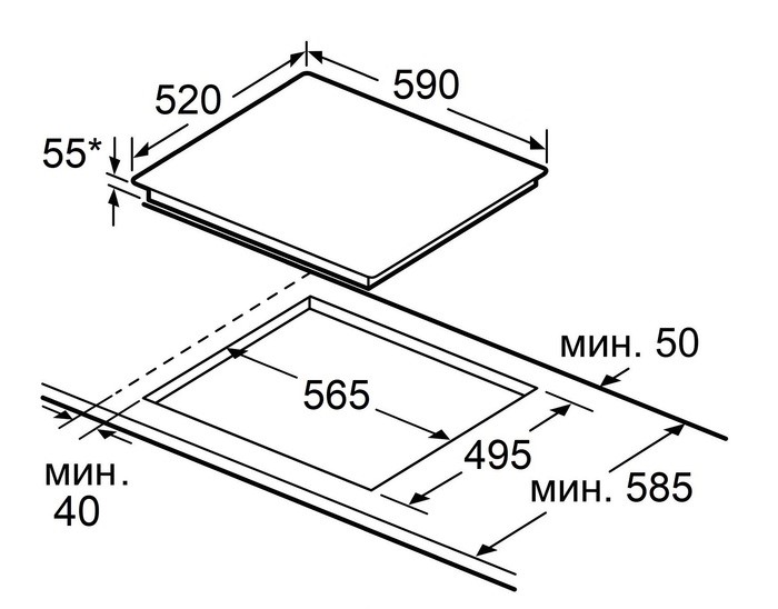 Характер огранки фаски на внешней стороне варочной панели. Металлические рамки предотвращают забивание монтажных швов крошками и пылью.