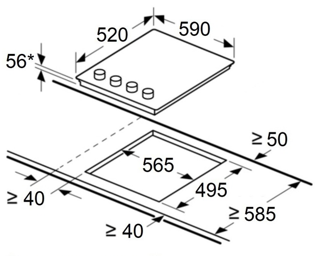 Характер огранки фаски на внешней стороне варочной панели. Металлические рамки предотвращают забивание монтажных швов крошками и пылью.
