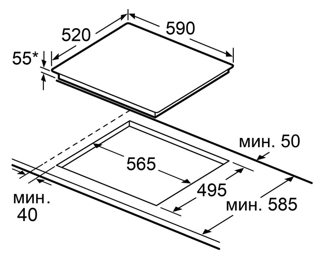 Характер огранки фаски на внешней стороне варочной панели. Металлические рамки предотвращают забивание монтажных швов крошками и пылью.