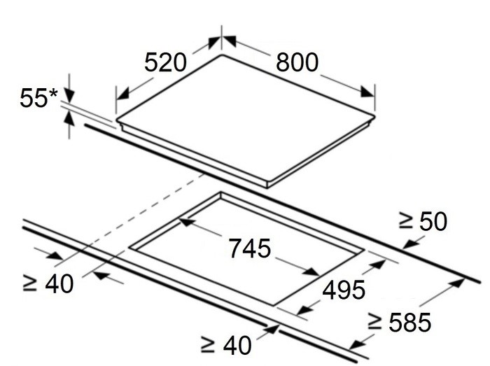 Характер огранки фаски на внешней стороне варочной панели. Металлические рамки предотвращают забивание монтажных швов крошками и пылью.