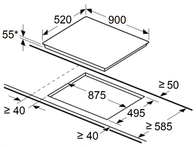 Характер огранки фаски на внешней стороне варочной панели. Металлические рамки предотвращают забивание монтажных швов крошками и пылью.