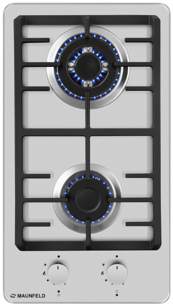 поверхность газовая, 30 см, газ на металле, 2 конфорки, решетки чугунные, нержавеющая сталь