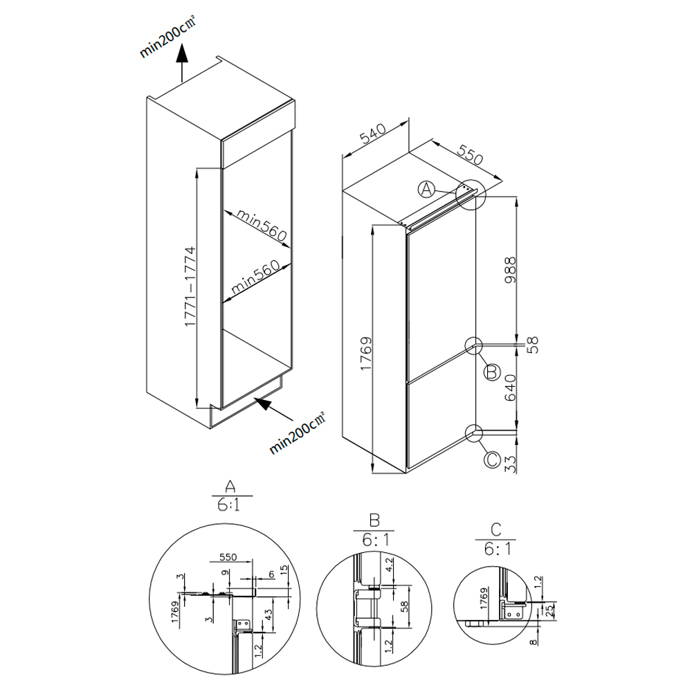 холодильник-морозильник встраиваемый, 241 л, класс энергопотребления А+, NoFrost, 54x55x176,9 см