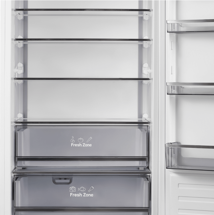 В зоне свежести температура держится на уровне 0°С, так продукты дольше остаются свежими. Подходит для свежего мяса, рыбы, фруктов, овощей.