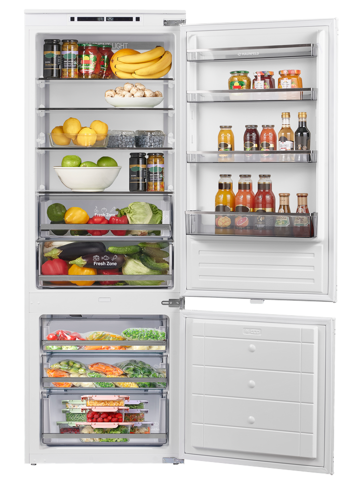 В зоне свежести температура держится на уровне 0°С, так продукты дольше остаются свежими. Подходит для свежего мяса, рыбы, фруктов, овощей.