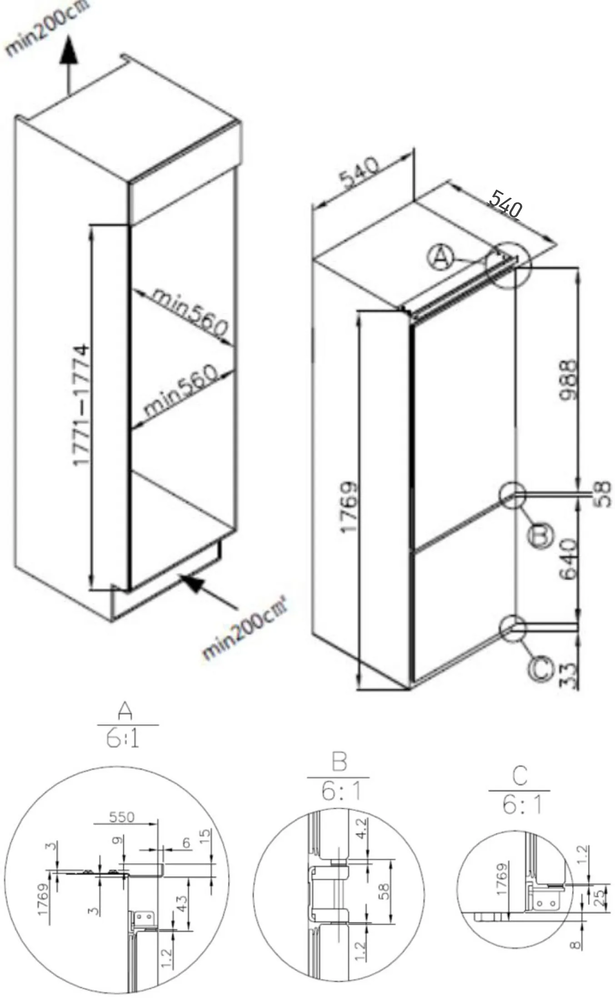 холодильник-морозильник встраиваемый, 281 л, класс энергопотребления А+, No Frost, 54х55х176,9 см