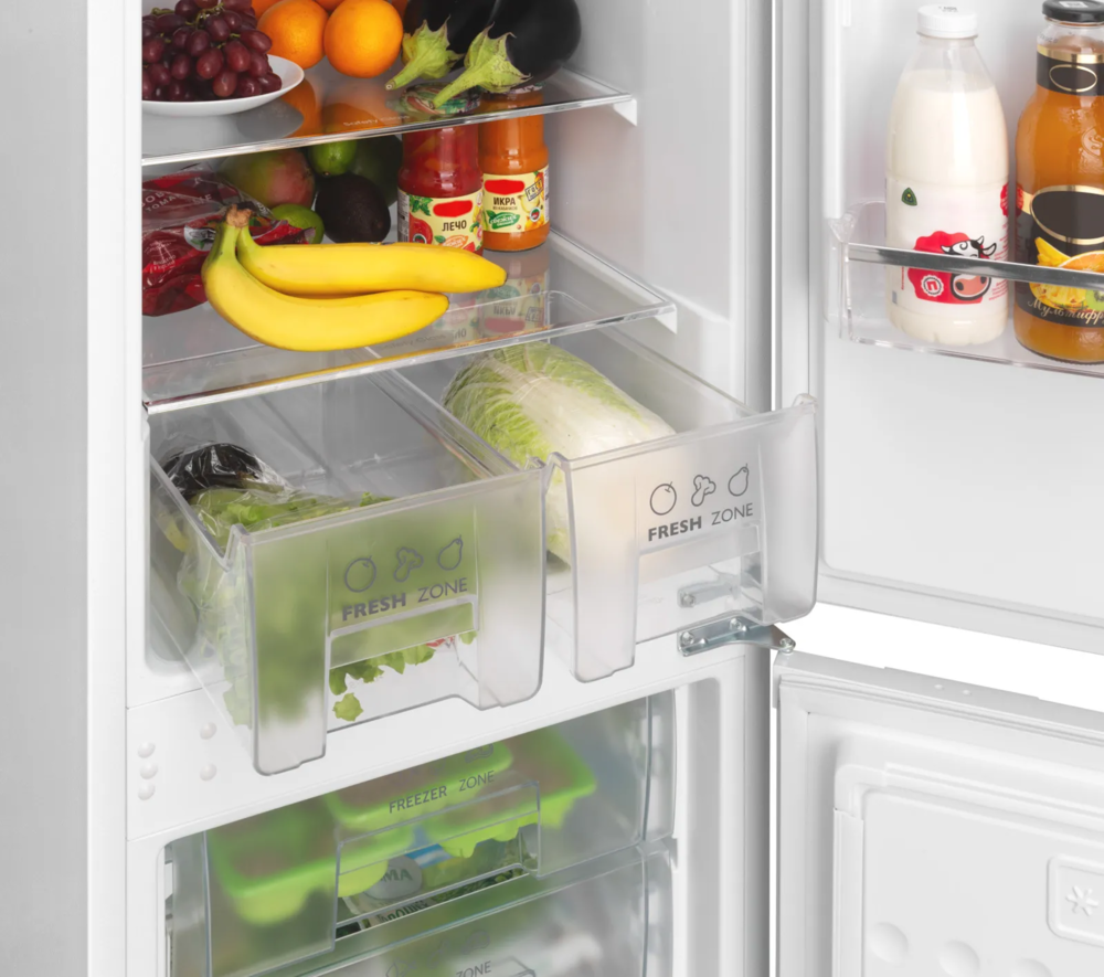 В зоне свежести температура держится на уровне 0°С, так продукты дольше остаются свежими. Подходит для свежего мяса, рыбы, фруктов, овощей.