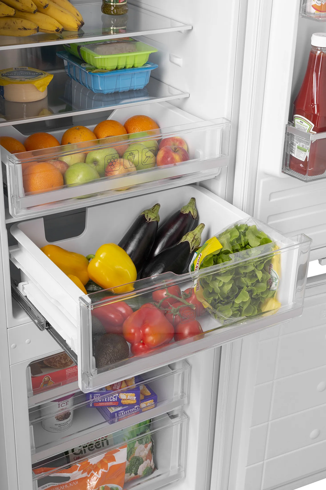 В зоне свежести температура держится на уровне 0°С, так продукты дольше остаются свежими. Подходит для свежего мяса, рыбы, фруктов, овощей.