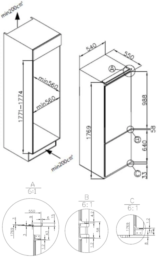холодильник-морозильник встраиваемый, 241 л, класс энергопотребления А+, No Frost, 54х55х176,9 см