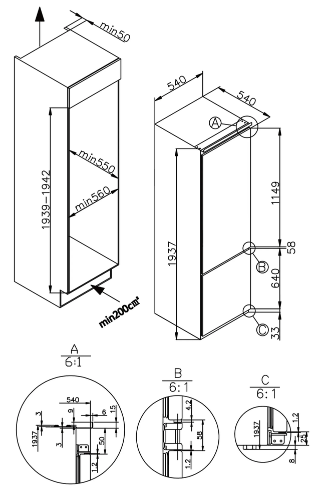 холодильник-морозильник встраиваемый, 300 л, класс энергопотребления А+, ручная система размораживания, 54х54х193,5 см