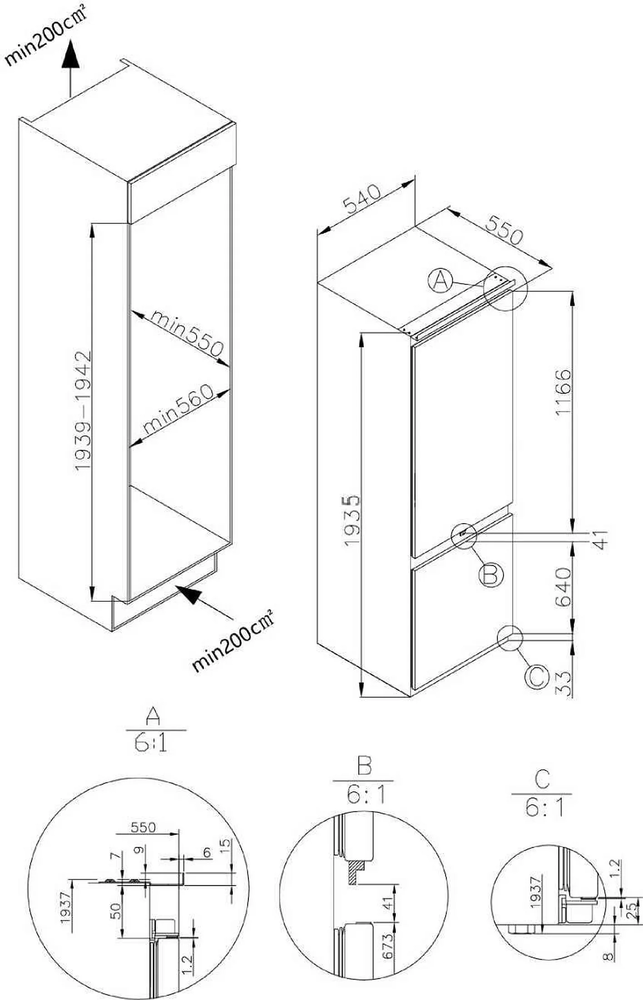 холодильник-морозильник встраиваемый, 273 л, класс энергопотребления А+, No Frost, 54х55х193,7 см