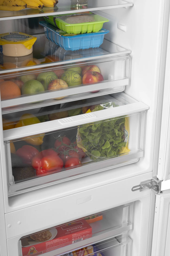В зоне свежести температура держится на уровне 0°С, так продукты дольше остаются свежими. Подходит для свежего мяса, рыбы, фруктов, овощей.