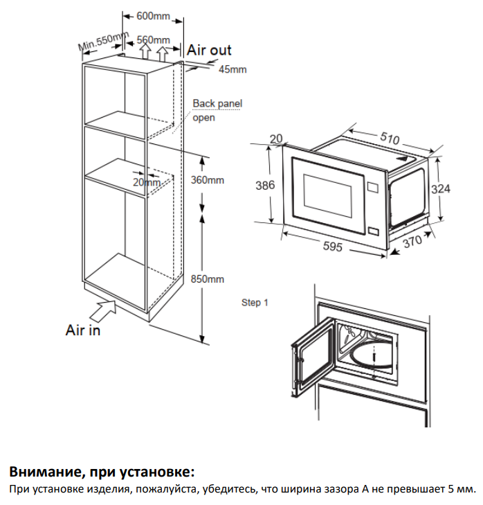 микроволновая печь встраиваемая, 25 л, 59,5х37,5х38,4 см, черный
