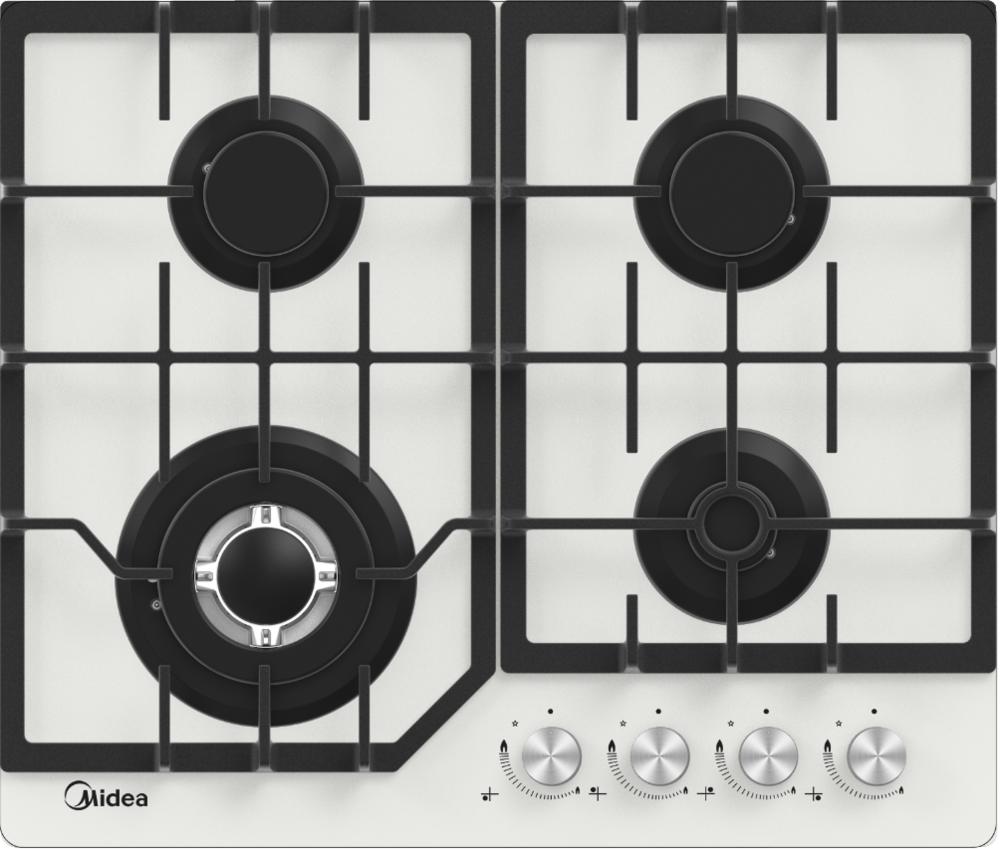 поверхность газовая, 60 см, газ на стекле, 4 конфорки, решетки чугунные, белый