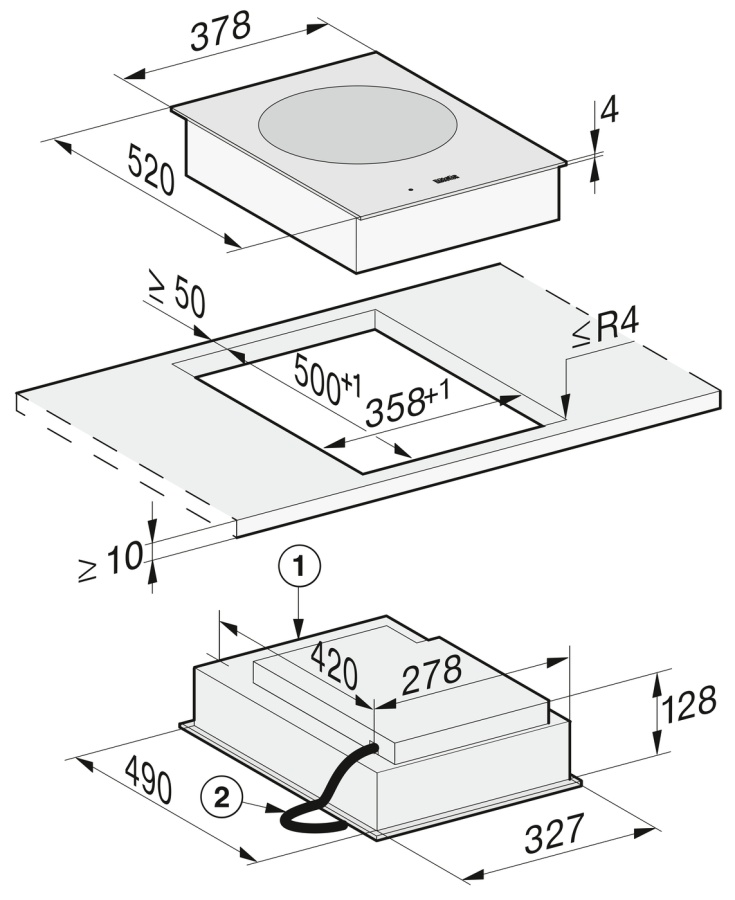 Характер огранки фаски на внешней стороне варочной панели. Металлические рамки предотвращают забивание монтажных швов крошками и пылью.
