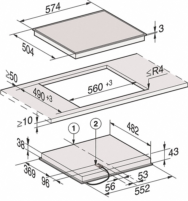 Характер огранки фаски на внешней стороне варочной панели. Металлические рамки предотвращают забивание монтажных швов крошками и пылью.