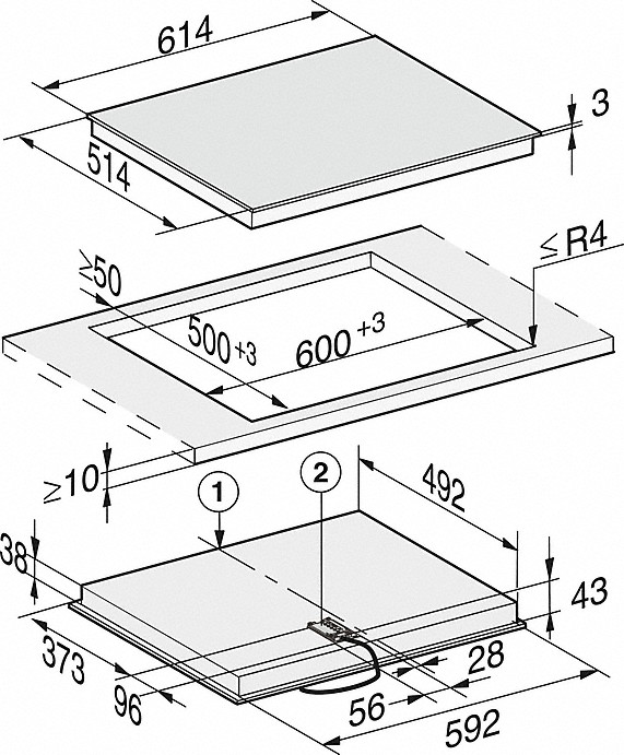 Характер огранки фаски на внешней стороне варочной панели. Металлические рамки предотвращают забивание монтажных швов крошками и пылью.