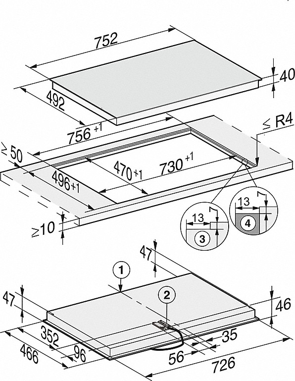 Характер огранки фаски на внешней стороне варочной панели. Металлические рамки предотвращают забивание монтажных швов крошками и пылью.