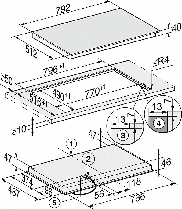 Характер огранки фаски на внешней стороне варочной панели. Металлические рамки предотвращают забивание монтажных швов крошками и пылью.